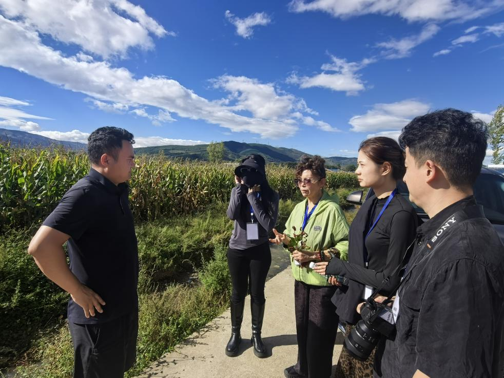 ▲特木里镇自然资源所勒苦拉萨所长带领调研团队参观蒉染工坊“蓼蓝种植基地”▲