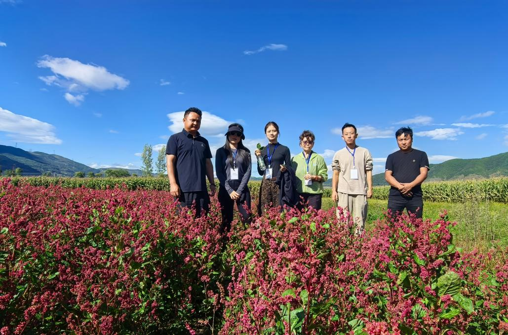 在特木里镇叶尔村村书记张杰引导下,团队首进蒉染原料 “蓼蓝” 留种田。张杰介绍,蓼蓝由蓝草改良驯化而来,一年一收,7 月收割根叶后,需晒干、剁碎、发酵并压成饼状;次年三四月份开工时,饼状原料化开加草木灰即可调配染料。蒉染技艺的工艺流程复杂而独特,体现了彝族人民的智慧与创造力。