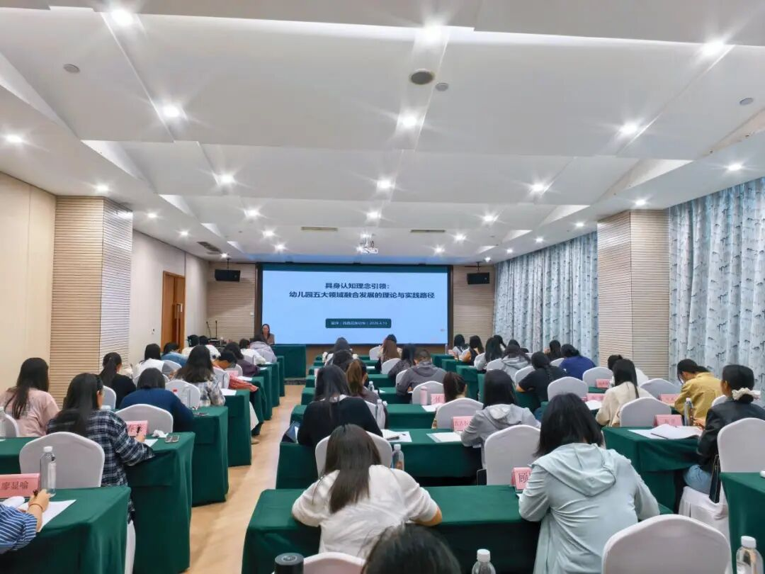 皇萍为培训班带来题为“具身认知理念引领:幼儿园五大领域融合发展的理论与实践路径”的专题讲座。皇萍是我校教学名师、高级双师型教师,长期从事学前教育、教师教育研究,在五大领域课程整合方面积累了丰富的理论与实践成果。讲座立足当前幼儿园保育教育高质量发展的现实需求,系统阐释了具身认知理念下健康、语言、社会、科学、艺术五大领域融合发展的理论逻辑、设计原则与实践路径。她还结合凉山本土资源,以“假如邛海没有水”“美丽的蓝花楹”等生动案例,具体呈现了如何基于具身认知理念设计跨领域主题活动,让幼儿在真实、可感、可操作的情境中获得整体性发展。